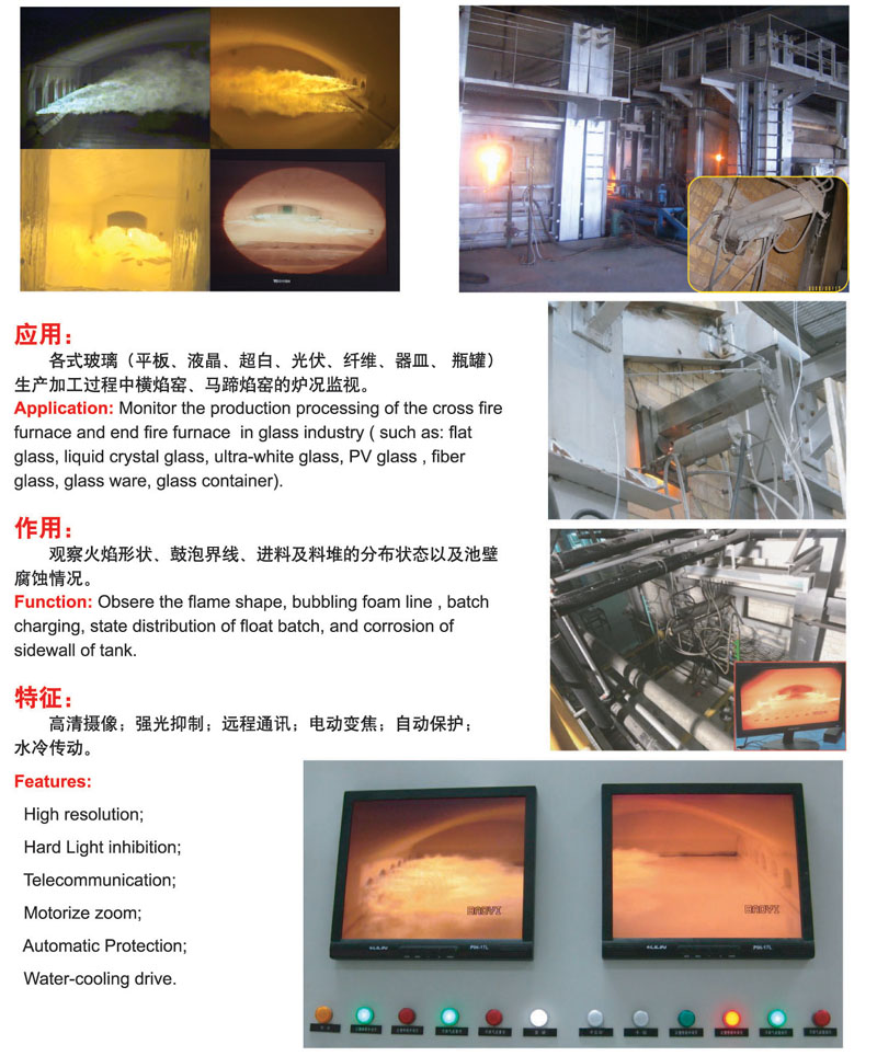 简介:熔窑高温摄像系统是一种窥式高温工业电视,专为玻璃工业熔窑内部视频监控而设计生产的高科技产品,它集光学、机电、电气于一体。正常工作时,内窥探头整体穿过高温炉墙,通过高温、高清模拟或数字摄像机实时在线传送内部图像,为适应不同的观察角度,内窥探头分别设计为直视与俯视二大类,这样基本能满足窑炉内部全方位360度的观察需求,从而为安全生产提供最直观的依据。整套系统采用水、气冷却的方式,摄像探头可伸入炉内10cm-400cm,在水气压力正常的情况下可长期工作在2000°C以下的窑炉内部,当水、气压力低于设定保护值或探头超过设定保护温度时,保护装置启动,探头自动退出炉外,同进关闭炉门。